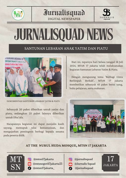 Liputan digital newspaper santunan yatim 10 Muharram 1446 H oleh ketua Jurnalistik Altha dari kelas 9.4